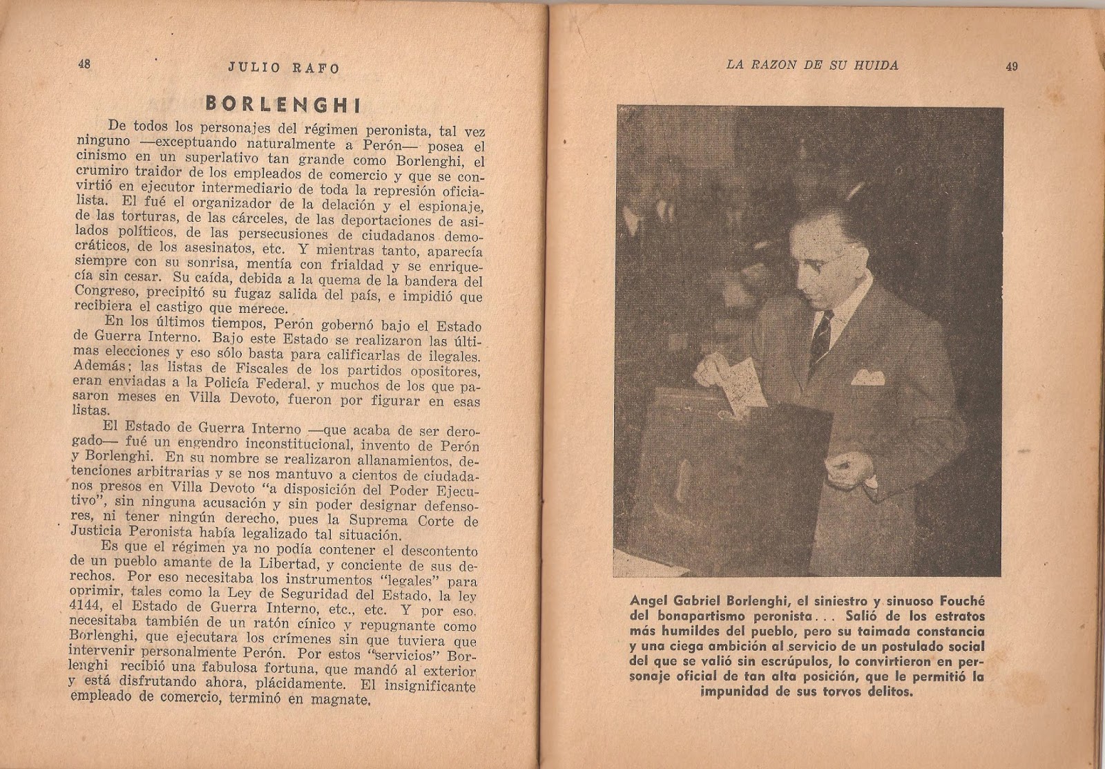 La semana pasada me encontré con el libro "La razón de su huida. Historia de una época infame", publicado en octubre de 1955 en Buenos Aires. El autor que figura es Julio Rafo, quien por lo que dice estuvo preso en algún momento de los gobiernos de Juan Domingo Perón y que por lo que se lee militaba en la izquierda (calculo que el Partido Comunista).